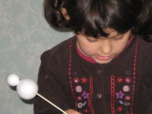 Aici, fiica mea e concentrată asupra unei arătări din mingi de ping-pong