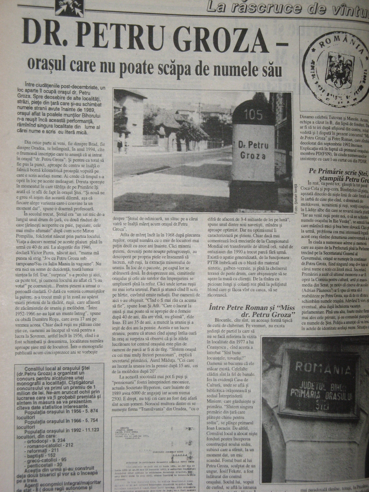 În anul 1993, spre final, am făcut un reportaj în Oraşul Dr. Petru Groza. A fost o călătorie fascinantă. I-am spus articolului de atunci Oraşul care nu poate scăpa de numele său. Oraşul avea să-şi schimbe, totuşi, numele, trei ani mai târziu, în 1996, de când i se zice Ştei. M-a bucurat să citesc, în anul 2008, un reportaj din Ştei, în Dilema veche. Unele lucruri nu s-au schimbat…