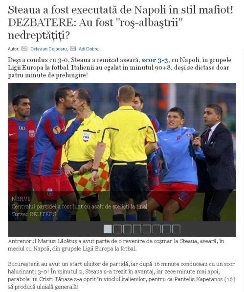 În primul rând, a fost un meci (Steaua – Napoli 3-3) palpitant. În al doilea rând, nu cred că trebuie să ne îndreptăm toată furia si toate frustrările înspre arbitrul polonez Borski. Poate că trebuia să încheie meciul după corner. L-a mai lăsat câteva secunde. Dar nu el i-a scos pe stelisti din careu în acele secunde în care încă se juca si erau vreo 6-7 jucători de la Napoli. Italienii puteau să mai dea, lejer, 5-6 goluri, în afară de cele 3 pe care le-au dat deja. Da, si Steaua a dat două bare într-o fază. Da, e posibil (probabil?) ca, dacă situatia ar fi fost inversată, dacă Steaua ar fi fost condusă si ar fi alergat după egalare, meciul să nu fi durat atât.