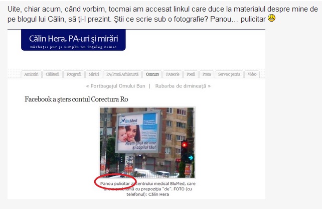 Evelin Ceciu, cel despre care am spus că este energia vie din spatele fenomenului Corectura.ro, a acordat un interviu cotidianului cultural ZiarulMetropolis.ro (felicitări Adinei Scorţescu pentru idee şi pentru realizare!). Atunci când vorbeşte despre reacţiile care au urmat ştergerii contului Corectura Ro de pe Facebook, Evelin aduce aminte şi de intervenţia mea şi are amabilitatea să ofere un link către articolul de pe acest blog şi să facă o… corectură amicală (vezi imaginea din deschiderea acestui articol).