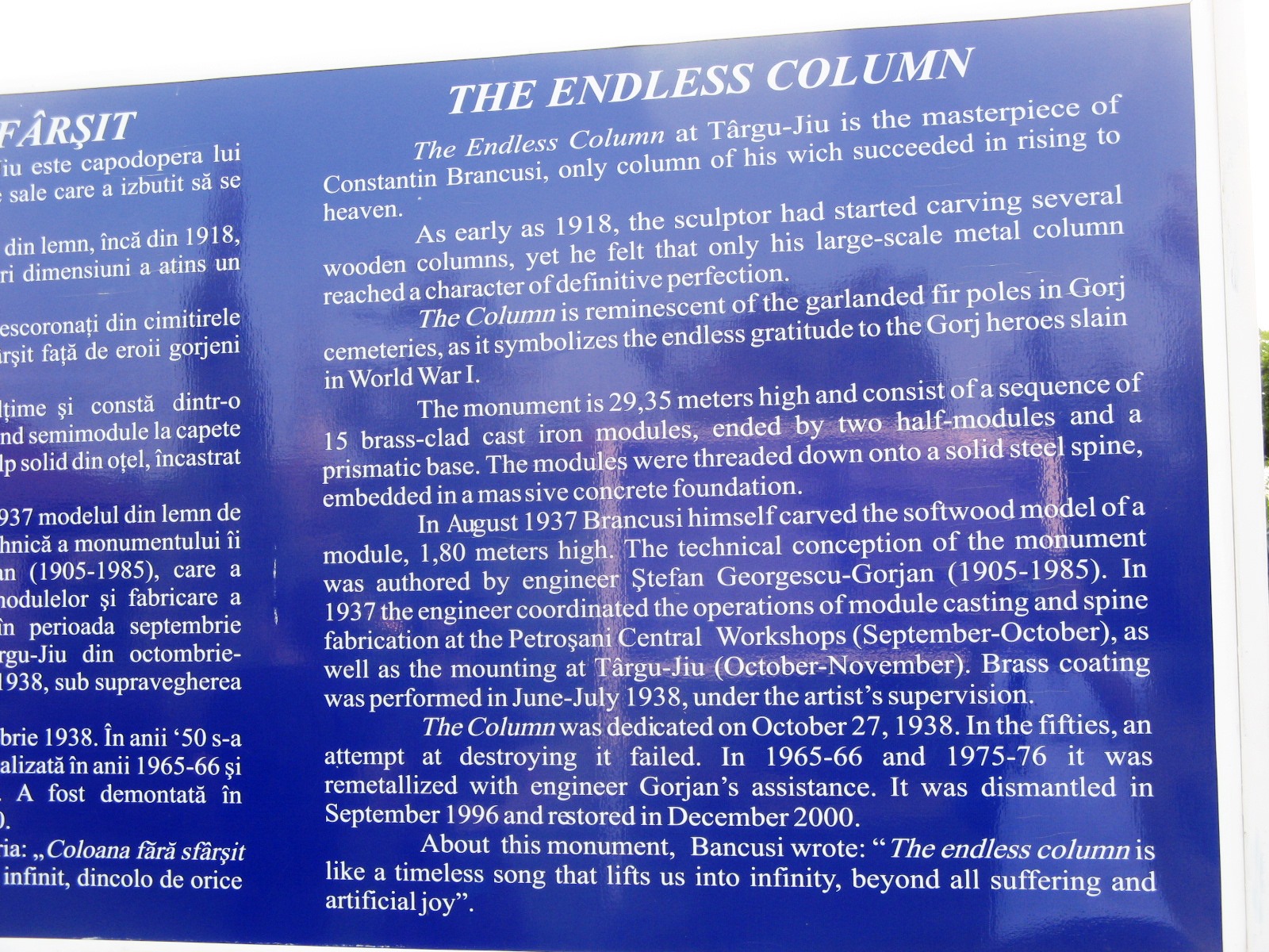 Coloana Infinitului, fotografiată vara. Foto: Călin Hera (mfc)