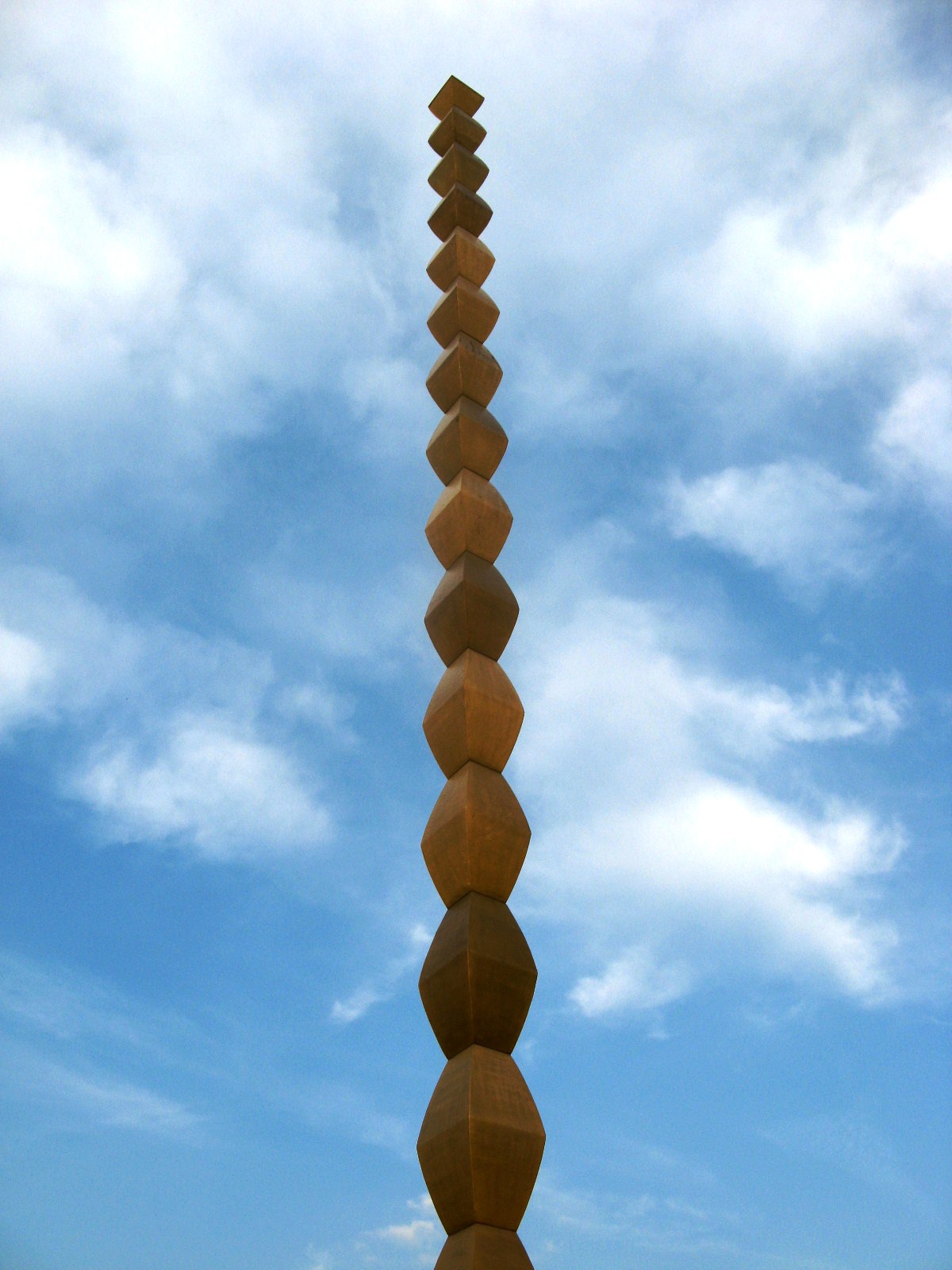 Coloana Infinitului fotografiată vara. Într-o vreme în care un Dorel cu voie de la o Direcţie de Cultură din Târgu Jiu a deteriorat Masa Tăcerii şi Poarta Sărutului, spălându-le cu furtunul, cu un jet puternic de apă, ne amintim că tovarăşii comunişti au tras cu tractorul s-o pună la pământ. Degeaba. Foto: Călin Hera