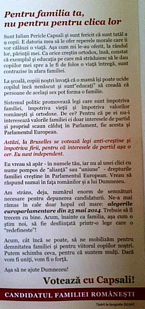 Am auzit comentariul: „Este cel mai stupid slogan electoral”. Voce de femeie tânără. Erau două tipe, coborau cu grijă scările de la metrou Piaţa Romană (dinspre coloane). În spatele lor, câţiva tineri împărţeau fluturaşii lui Iulian Capsali. Tipul candidează ca independent, pe o platformă radical ortodoxă, având în centru ideea de familie. Se mândreşte cu faptul că are nouă copii şi critică deschis avortul şi „legile anti-creştine şi împotriva firii”. Premiul luat la Eurovizion de femeia cu barbă le-a oferit celor care se ocupă de campania lui Capsali prilejul unui slogan creativ: „Votează bărbatul cu barbă!”. A prins sau n-a prins? Greu de spus. Judecând după reacţia domnişoarei la care m-am referit la început, nu prea. „Cine a venit cu ideea asta ar trebui să-şi dea demisia”, i-a ţinut isonul tovarăşa ei de coborâre pe scările pline de fluturaşii lui Capsali. Eu cred că ăla/aia care a avut ideea n-are de ce să-şi dea demisia. Are umor, e pe linia Capsali, vizează publicul tânăr. Care, însă, nu se mai prea uită la Eurovizion. Ce muzică mai e şi aia?