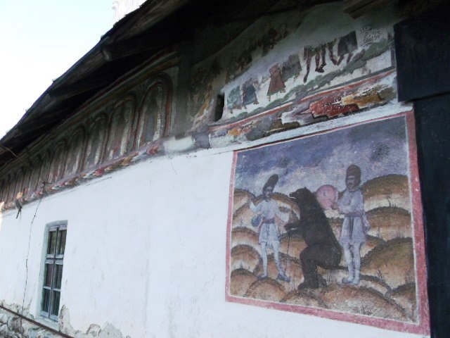 Dar nu trebuie să căutaţi numaidecât creştinism în aceaste imagini. Nici în scena cu ursul, pe care ctitorii bisericii au ales s-o arate, mare, la intrarea în aşezământ. Nici în cea de sub streaşină. Sunt desene naive, cu linii abrupte, mult diferite de cele care îmbogăţesc bisericile din Bucovina, care sunt mai elaborate, cu accent pe culoare, pe mesajul din Biblie.