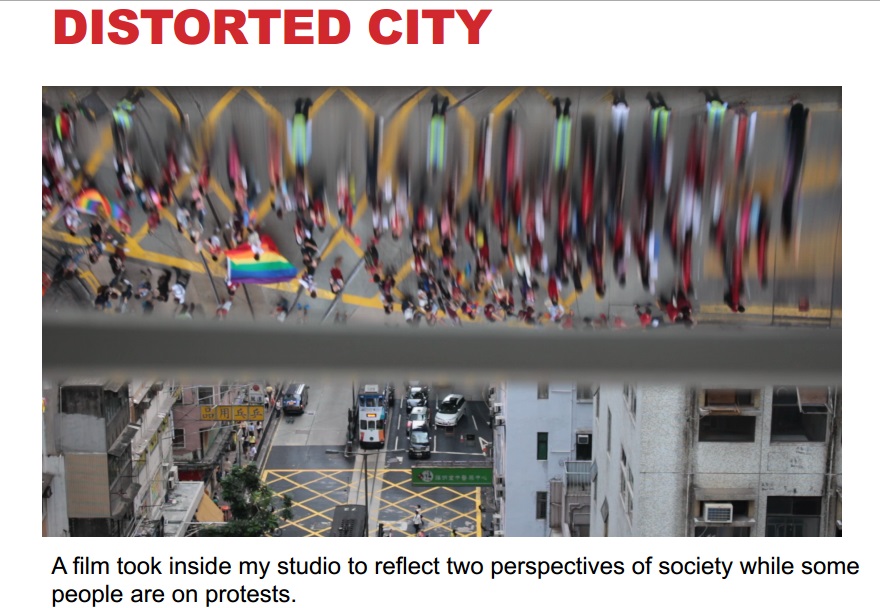 Lucrarea ei, filmul „Oraşul distorsionat” („Distorted City”), a fost realizată de la fereastra studioului ei, într-o fază incipientă a demonstraţiilor şi prezintă două perspective ale societăţii în mijlocul căreia trăieşte, confruntată cu un protest de mare amploare. Studioul artiştilor Chloe Cheuk şi Kenny Wong se află în clădirea Foo Tak, aflată pe o stradă din centru, Hennessey Road, pe unde protestatarii trec frecvent.
