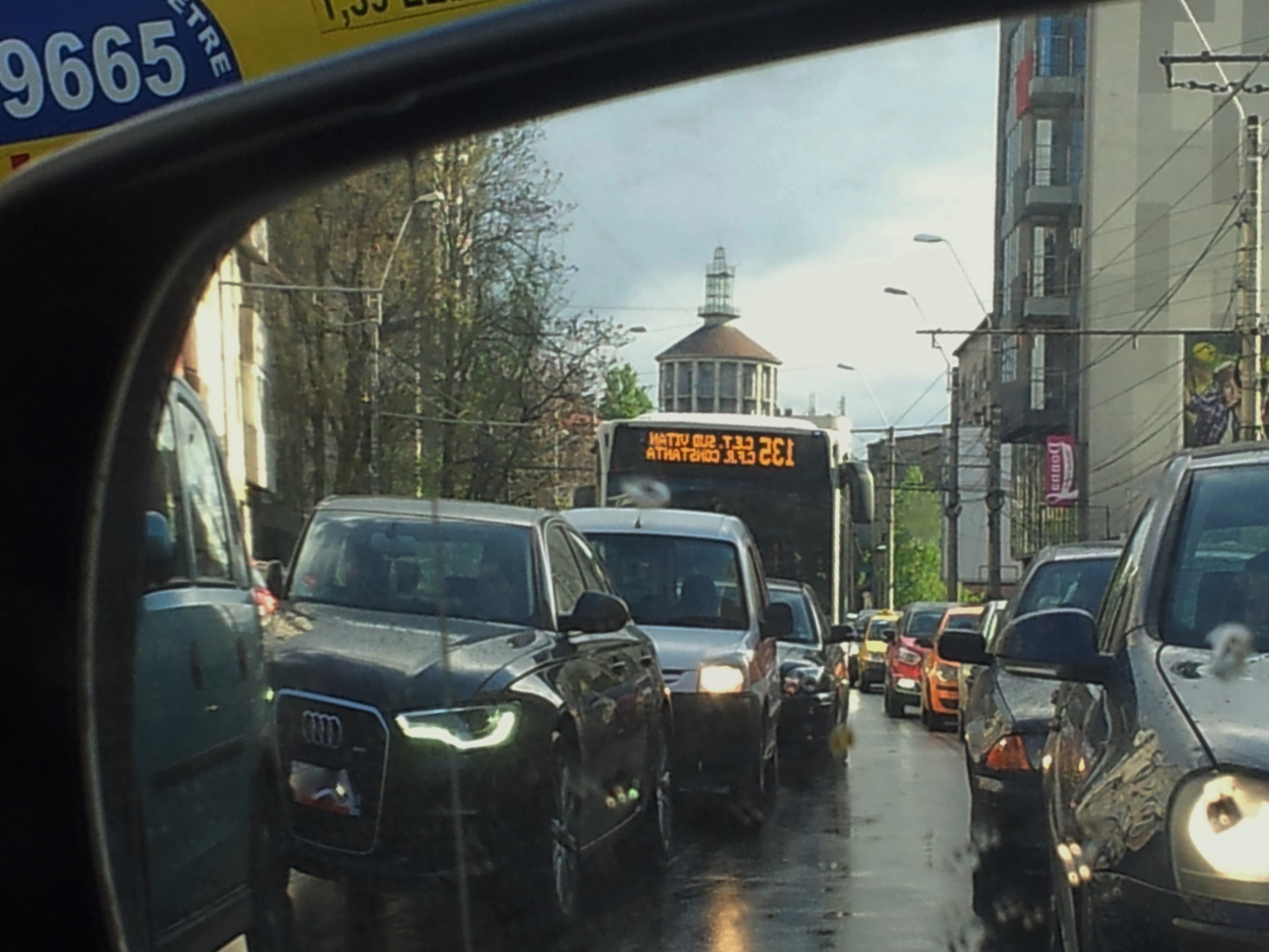 Vedere din București. Foișorul de foc văzut în oglinda retrovizoare, 5 minute mai târziu. Foto cu telefonul: Călin Hera