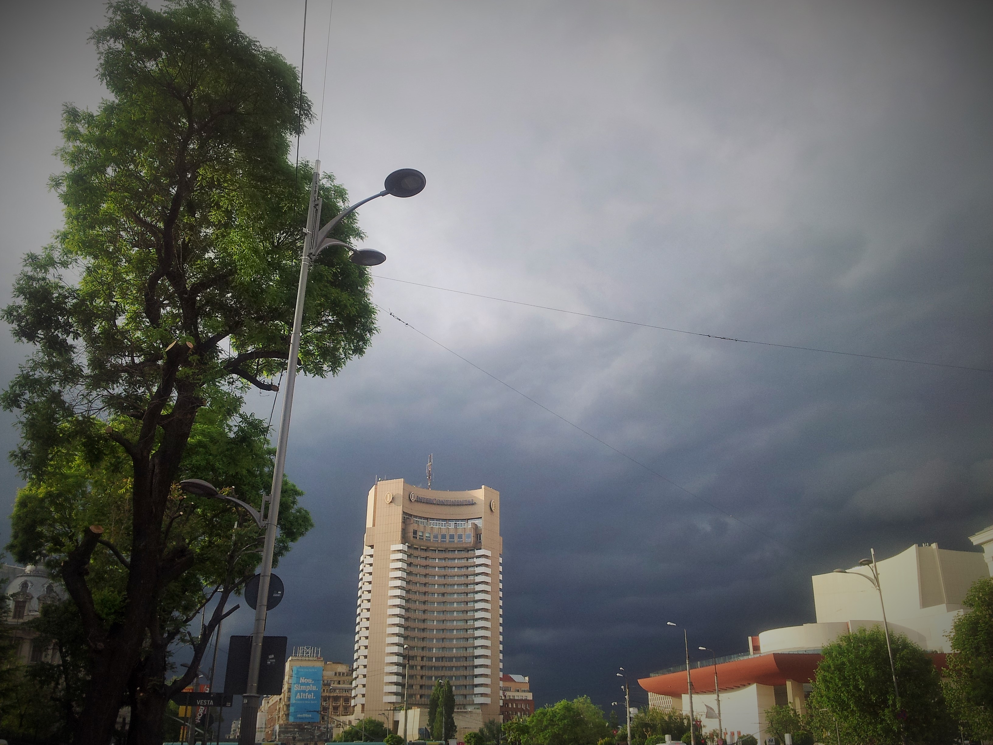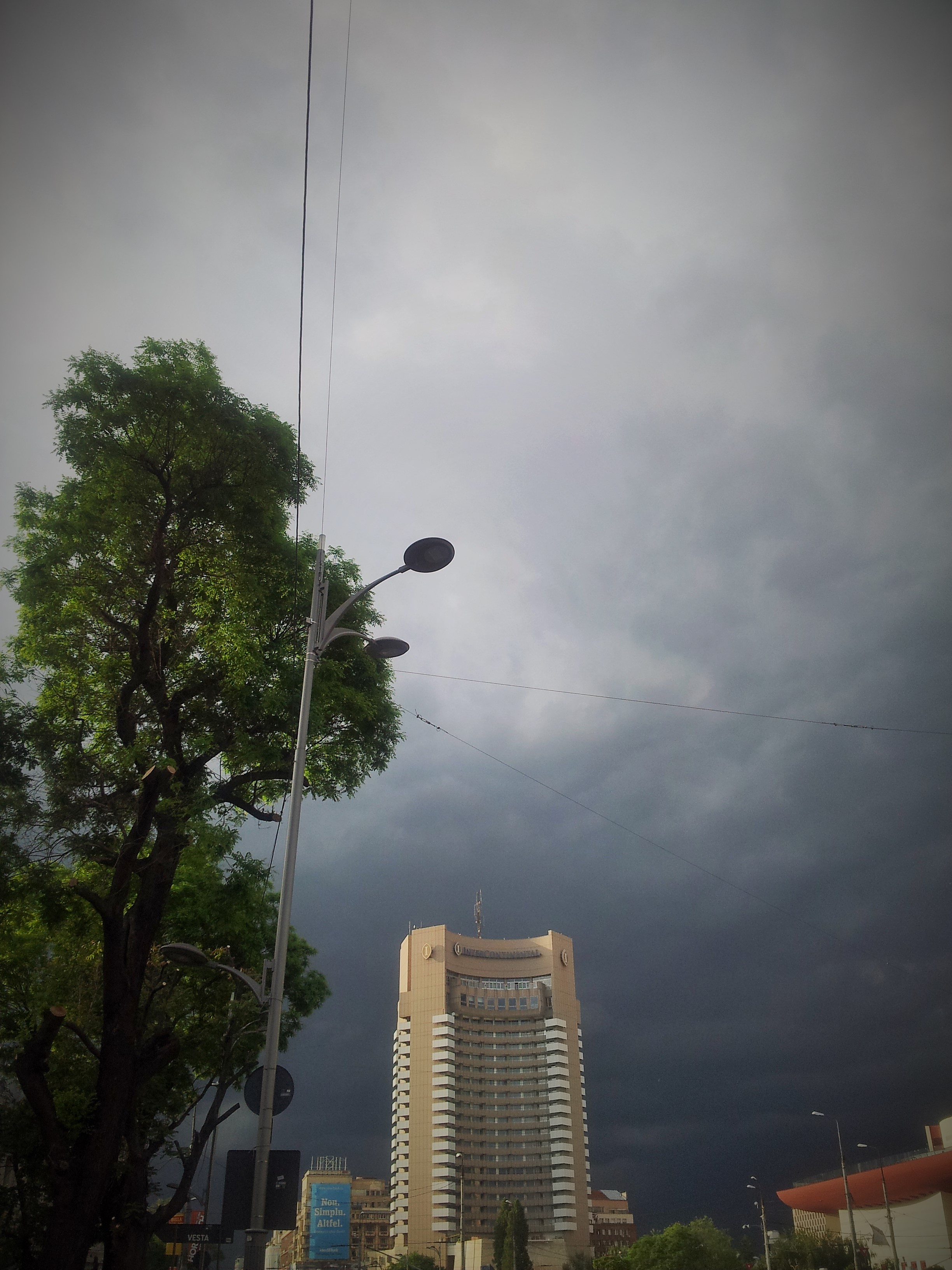 Vedere din București. Cer înfocat deasupra hotelului Intercontinental și a Teatrului Național. Foto cu telefonul: Călin Hera