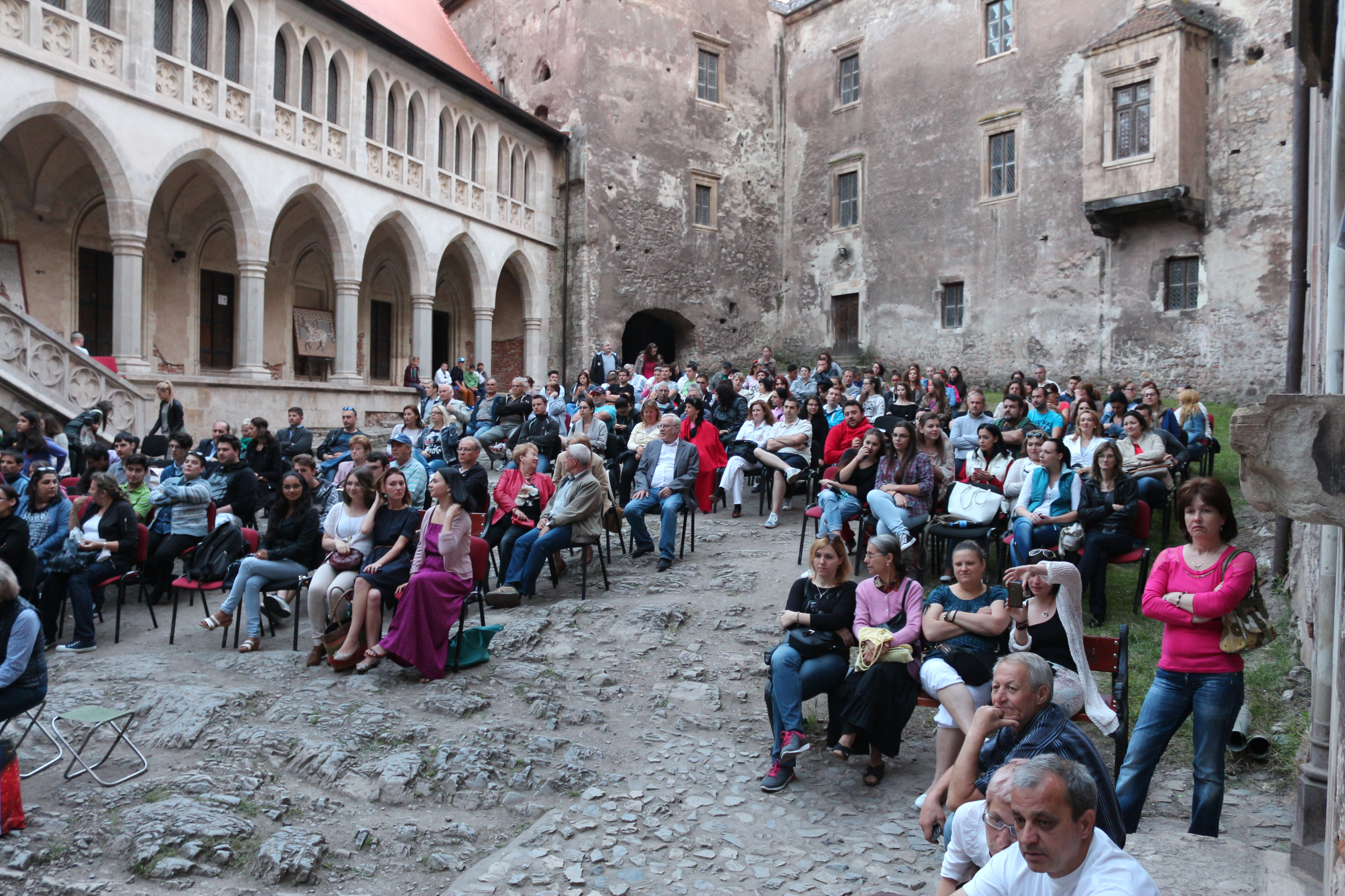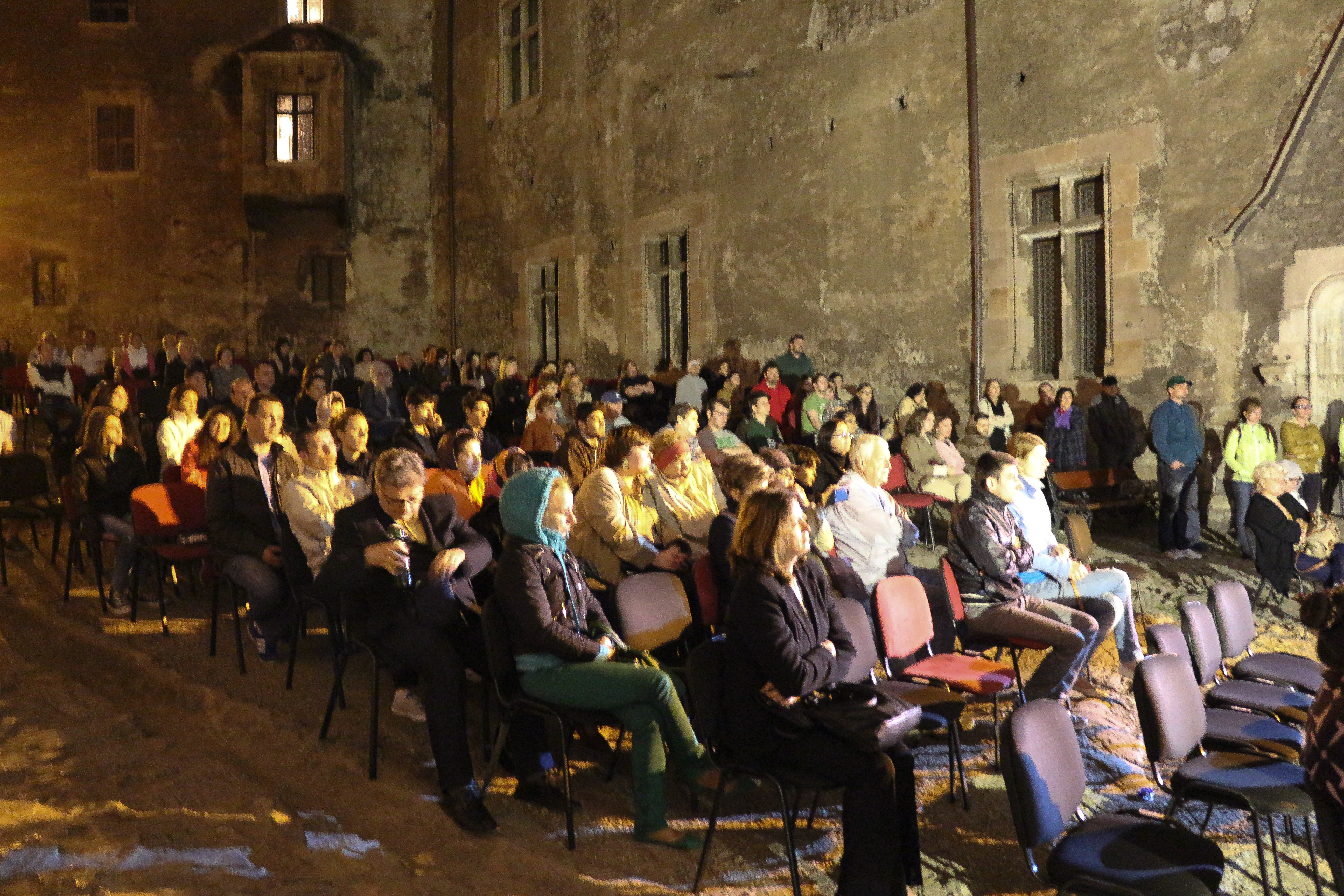 Vedere din Hunedoara. Spectatorii din curtea Castelului Corvinilor, cu ochii pe filmul De ce eu?, adus de Festivalul Filmului European. Sursa: castelulcorvinilor.ro