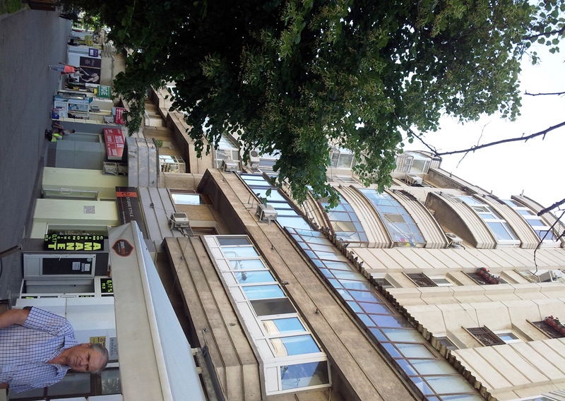 Vedere din București. Trotuar și bloc – cu muncitori odihnindu-se pe locul pe care se afla Biserica Sfânta Vineri. Foto cu telefonul: Călin Hera