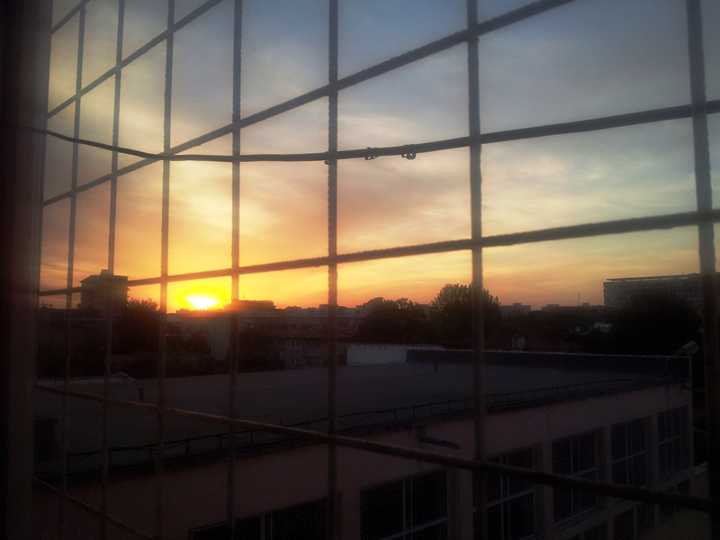 Cunosc copii bucuroși că a început școala. Cunosc copii triști că s-a terminat vacanța. M-am gândit la fiecare categorie de copii atunci când am fotografiat acest apus de soare, văzut de la ultimul etaj al unei școli bucureștene.