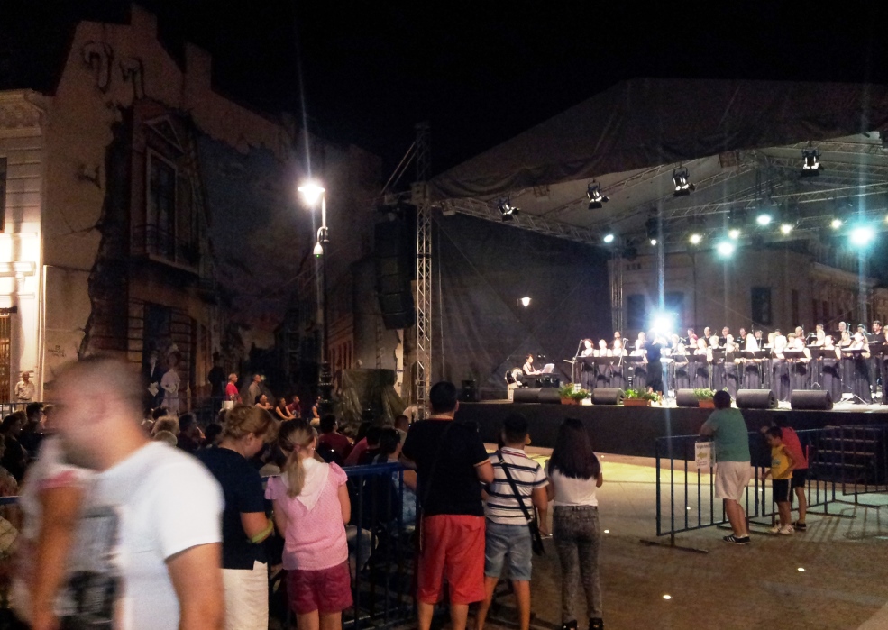 Vedere din Craiova. Scenă montată în zona pietonală a centrului vechi, cu concert. Foto cu telefonul: Călin Hera