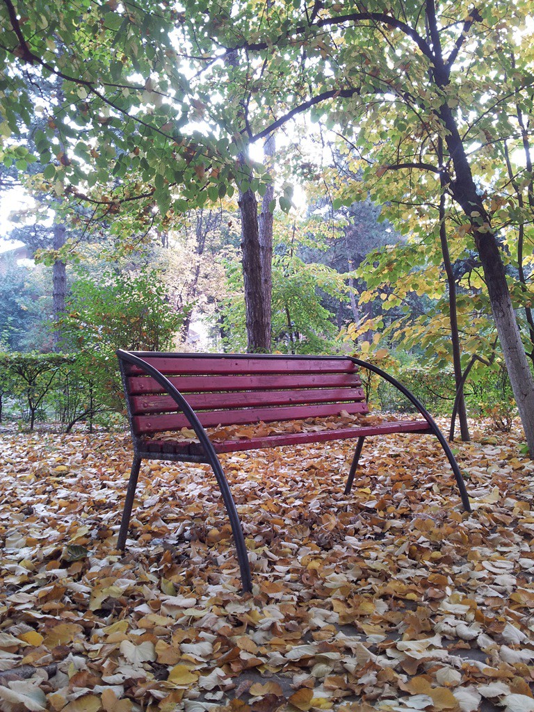Vedere din Bucureşti. Bancă de toamnă în curtea FJSC. Foto cu telefonul: Călin Hera