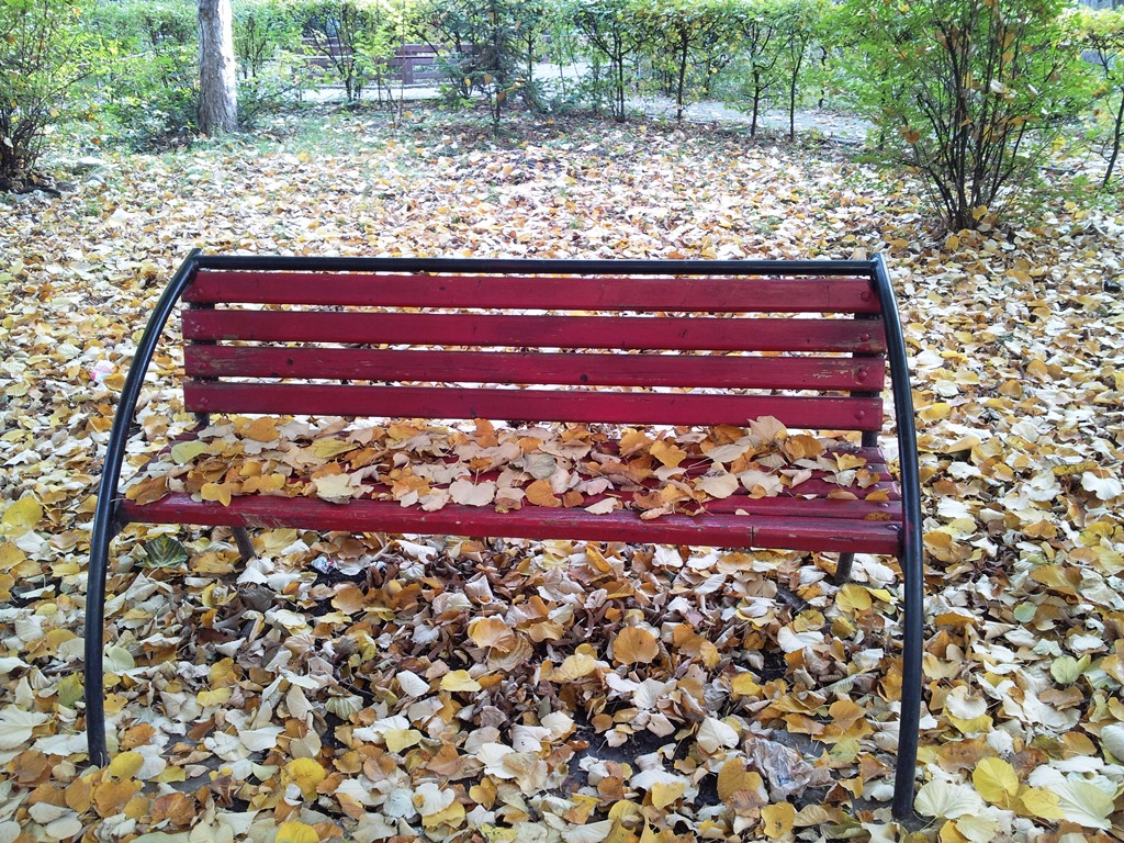 Vedere din Bucureşti. Bancă de toamnă în curtea FJSC. Foto cu telefonul: Călin Hera