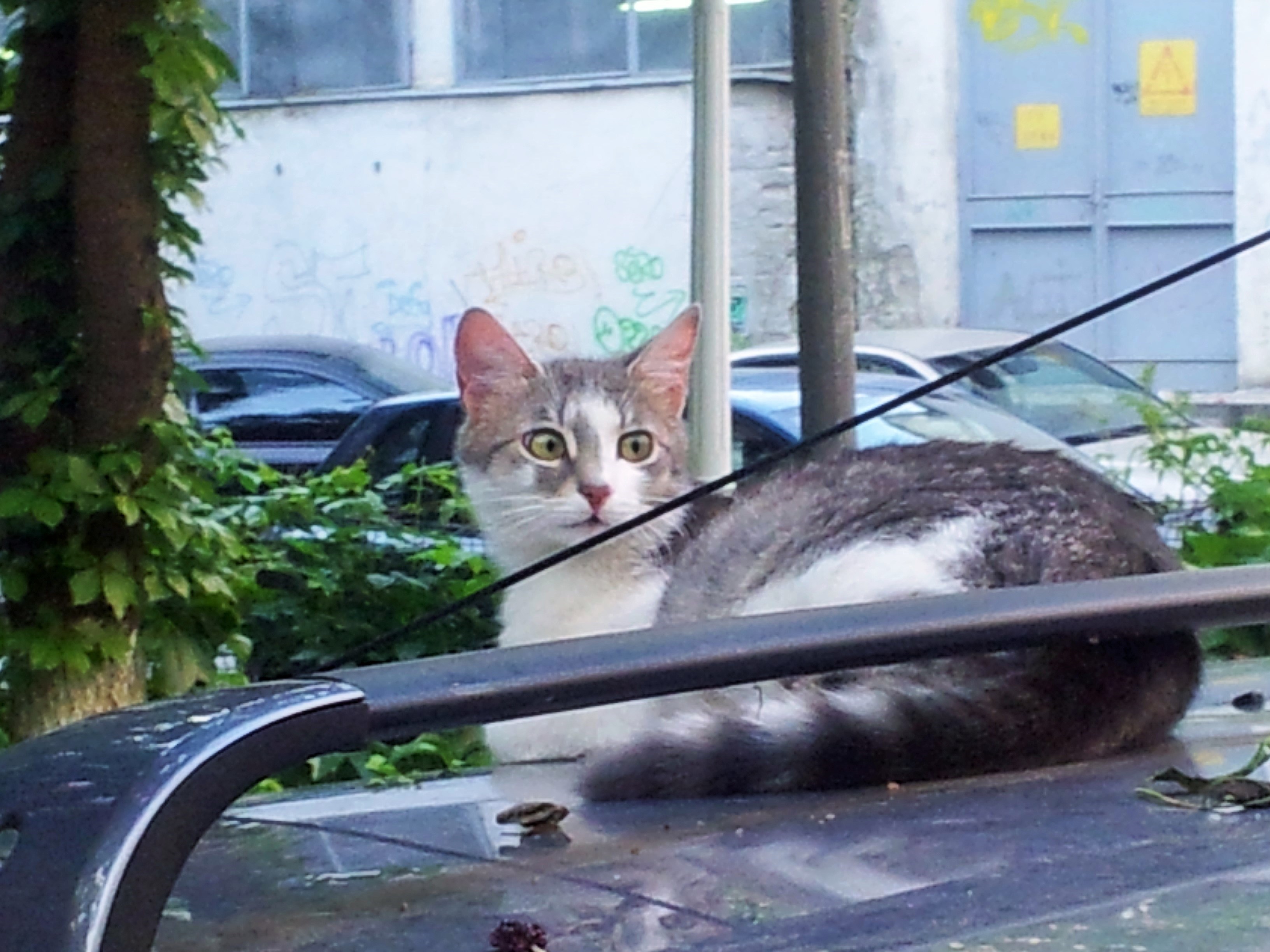 Vedere din Bucureşti. Pisica pe capota fierbinte. Foto cu telefonul: Călin Hera (MfC)