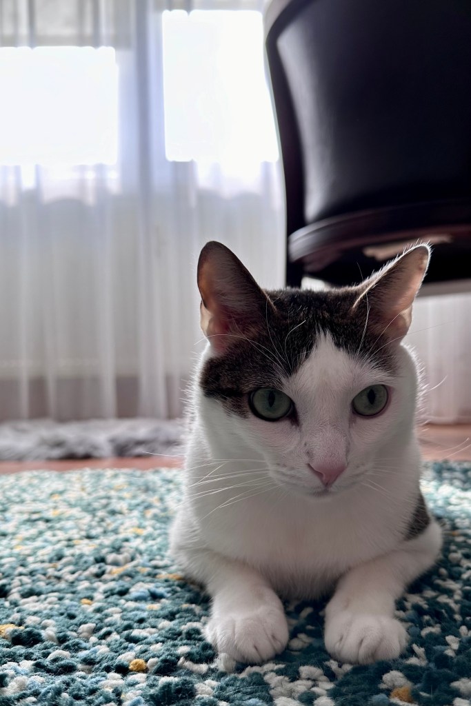 De regulă, motănelul e foarte vioi dis-de-dimineață. Așteaptă cuminte să mă trezesc. Dacă i se pare că durează prea mult vine tipil. Îmi dă cu lăbuța pe față. Primul lucru pe care îl fac e să îi pun mâncare în bol. Și apă proaspătă. Stă deoparte. Toarce domol. Știe că i se cuvine. Când termin, mă privește lung. Parcă ar zice: „E bine”. Mănâncă încet, tacticos. Apoi are chef să se joace. Proiectez lumini pe perete. Îi place.