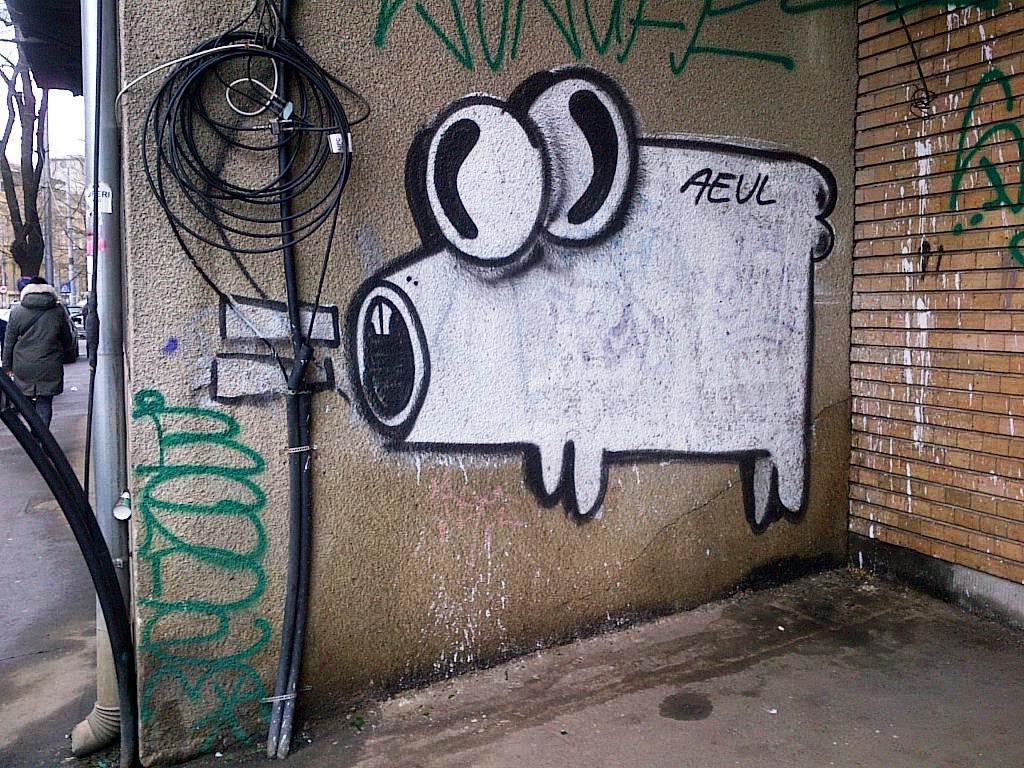 Am trecut de mai multe ori pe lângă această imagine. Dar ce e Aeul? Desenul înfăţişează un animăluţ situat undeva între porcuşor şi câine, cu ochii bulbucaţi şi picioarele ca nişte ugere, plus o codiţă îmbârligată şi un bot care aduce a conductă. Altfel, ansamblul e simpatic/jucăuş.
