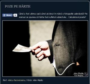 Alex Mazilu abordează un subiect drag mie, întrebând simplu: de când n-aţi mai pus mâna pe o fotografie pe hârtie? Şi tot el răspunde: pe vremuri se spunea că fotografia fură sufletul. Ce se poate spune, azi, despre calculator?