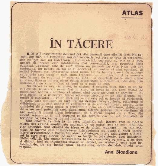 Text de Ana Blandiana, scris la rubrica Atlas în România literară (cred, dar nu sunt sigur) în toamna anului 1986