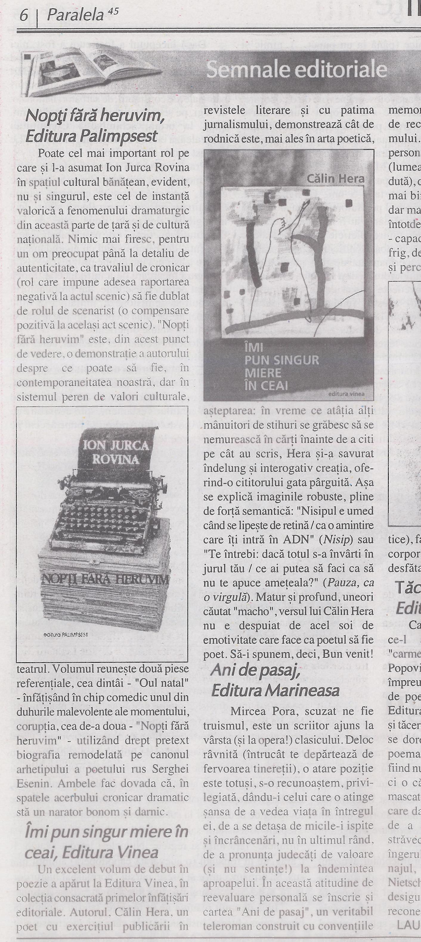 Am primit un ziar din Timisoara, Renasterea bănăteană, care contine o cronică de carte, unde Laurentiu Nistorescu (nu-l cunosc) scrie despre cartea mea.