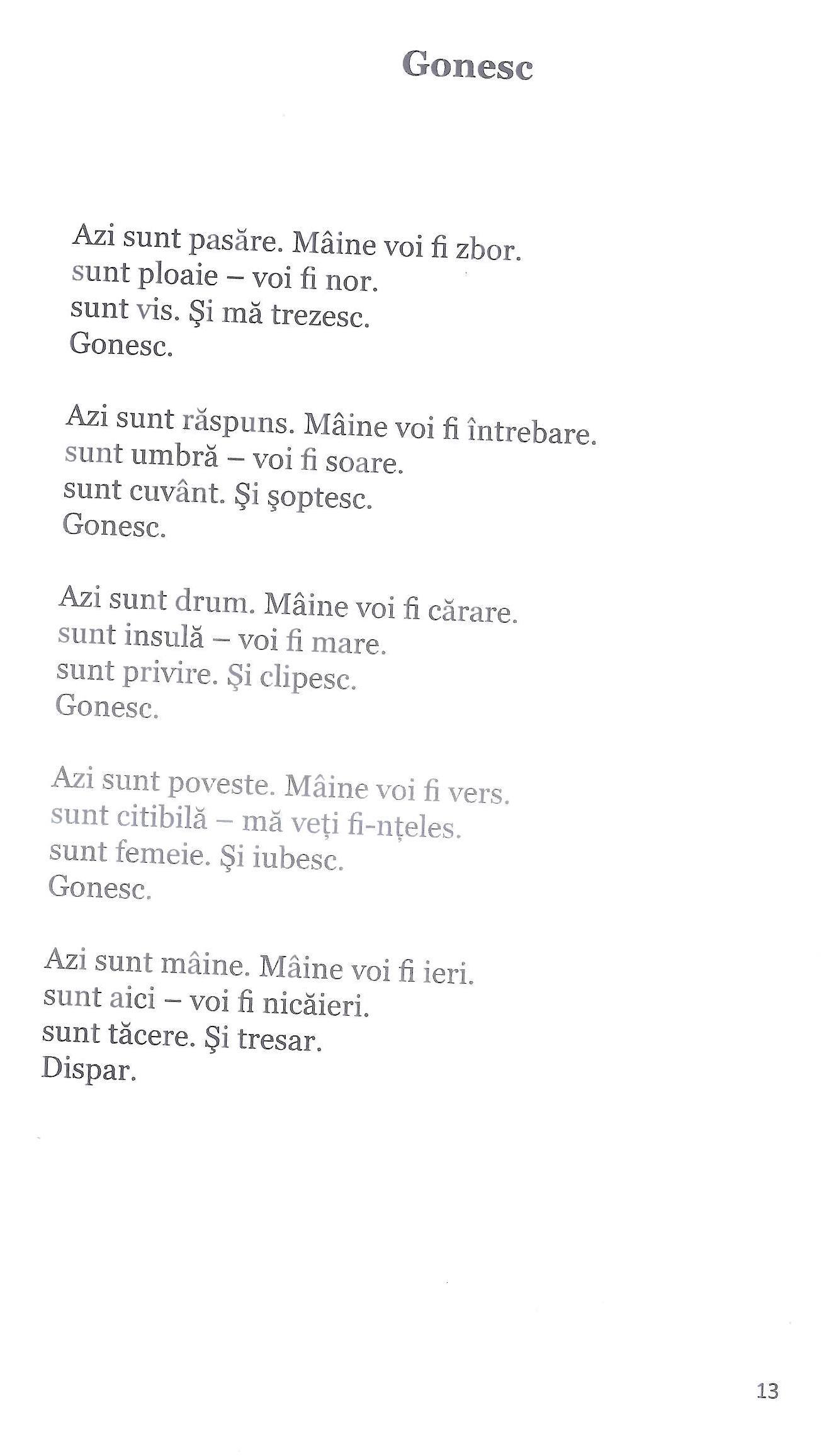 Prima carte cumpărată e cea a Adelei Onete. Am sperat până în ultima clipă, clipa în care m-am trezit în fata editurii Ars Docendi, că o voi întâlni acolo. (Sper că lui Victor îi e din ce în ce mai bine!). N-am întâlnit-o, dar am găsit cartea, a cărei copertă o stiti deja. Cartea n-are încă autograful Adelei, dar îl va avea, o stiu. Am scanat pentru voi un poem care-mi place foarte mult, poemul de la pagina 13: