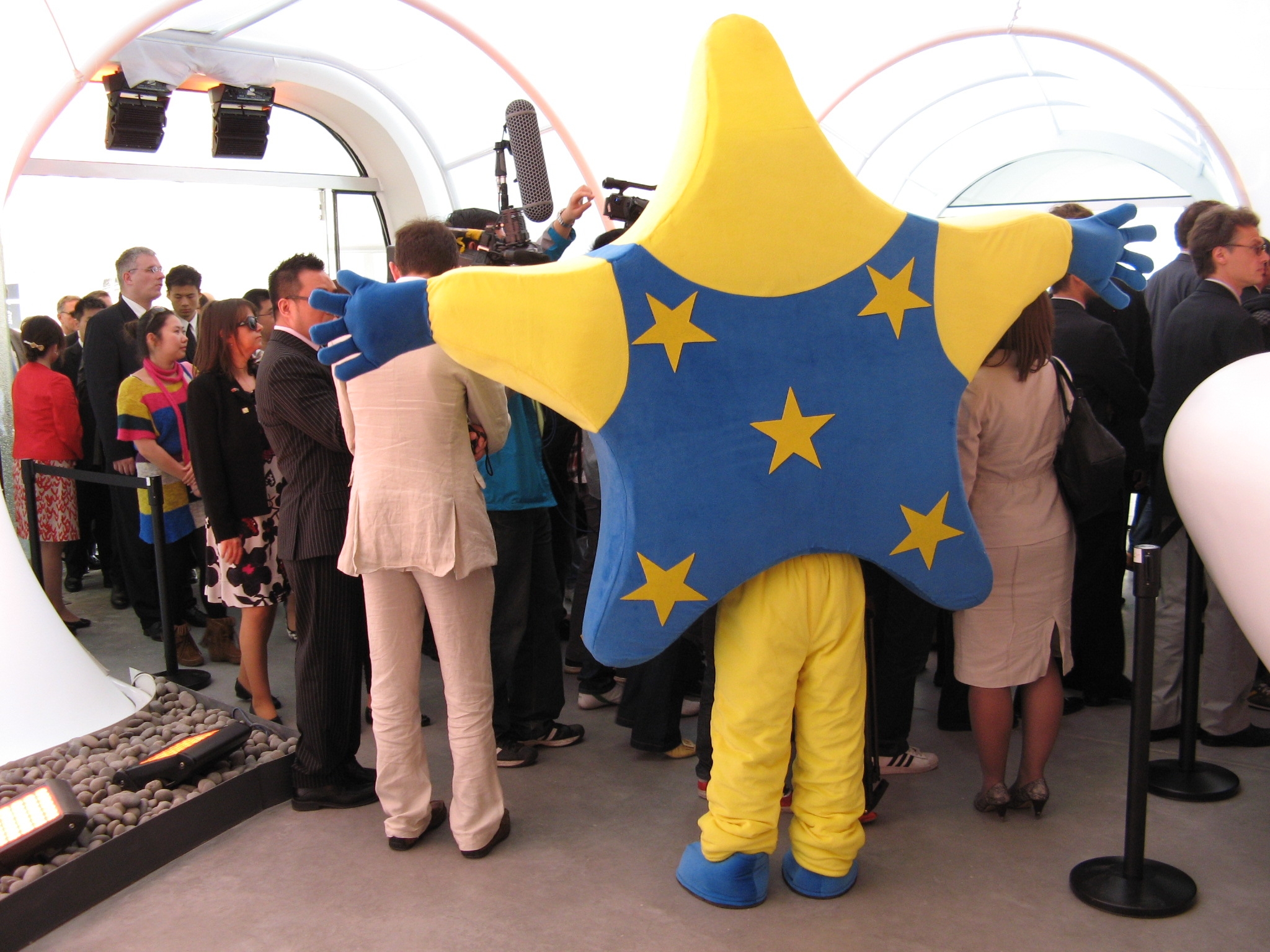 Era o îngrămădeală simpatică, civilizată, la intrarea în Pavilionul Belgiei & UE. Părea că aceia care nu puteau intra pe usă, pătrundeau pe geam. Ca ziaristii. Îngrămădeala era sporită de puzderia de jurnalisti adusi acolo de un eveniment: prezenta lui Jose Manuel Barroso. Nu multi stiau prea bine ce e cu el, dar era anuntat în program, împreună cu informatia că omul e ceva sculă mare prin Europa. Eram prea binedispus ca să mă enervez că trebuie sa astept să treacă valul. M-a binedispus si tipul care, îmbrăcat în stea UE, ghida oamenii, si faptul că, intrasem, la propriu, pe geam (mă rog, pe o intrare neoficială, dar foarte functională) si puteam privi detasat.