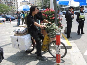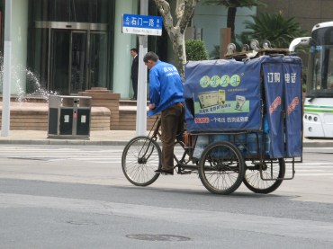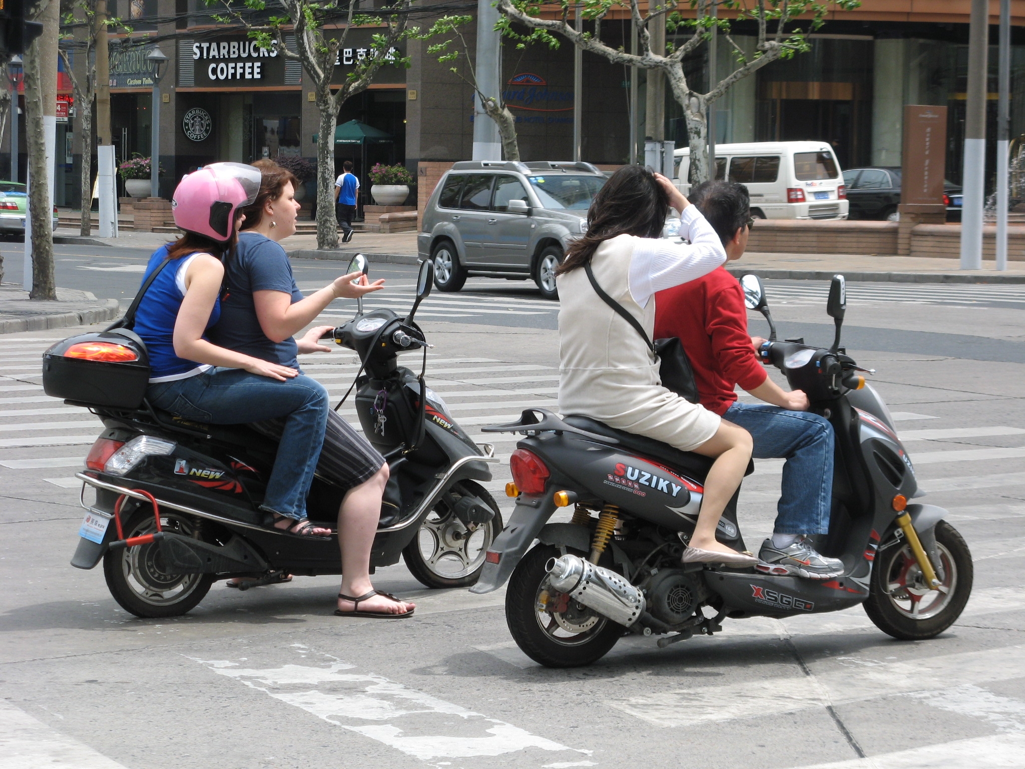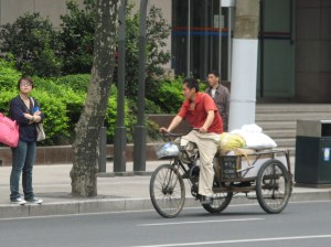 Oamenii nu doar că merg la serviciu pe două roţi, ci şi transportă: lucruri, unele foarte voluminoase, şi persoane (am văzut familii întregi pe o bicicletă tip Tohan!). Totuşi, a circula astfel prin Shanghai nu e prea sănătos. Nicăieri n-am aflat mai mult smog. Măştile rămase de la porcină prind bine şi unui pieton.
