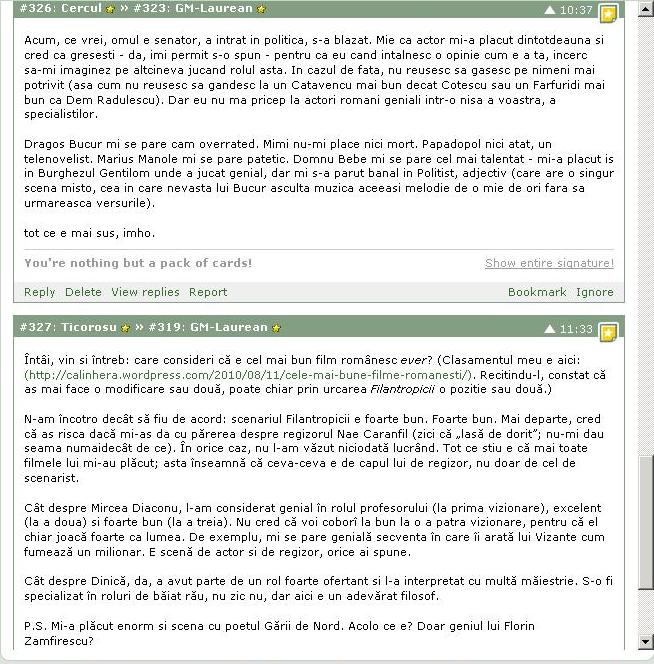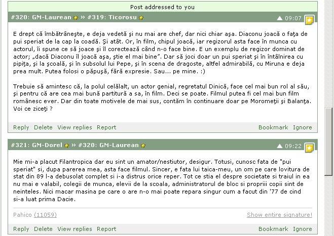 Printscreen al unei discutii despre filmul Filantropica (Nae Caranfil), care a avut loc pe forumul Pahico, în hattrick.org (4)