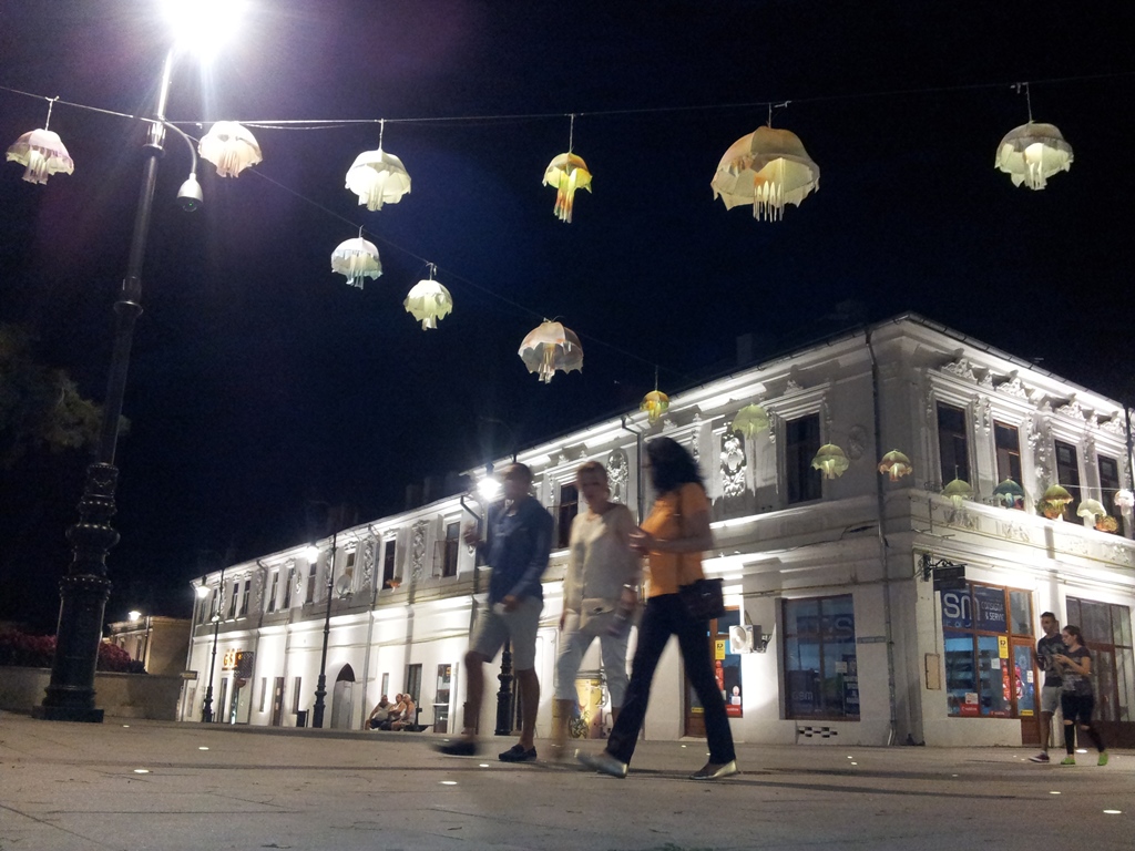 Vedere din Craiova. Zonă pietonală în centrul vechi, noaptea, cu umbrele luminoase. Foto cu telefonul: Călin Hera