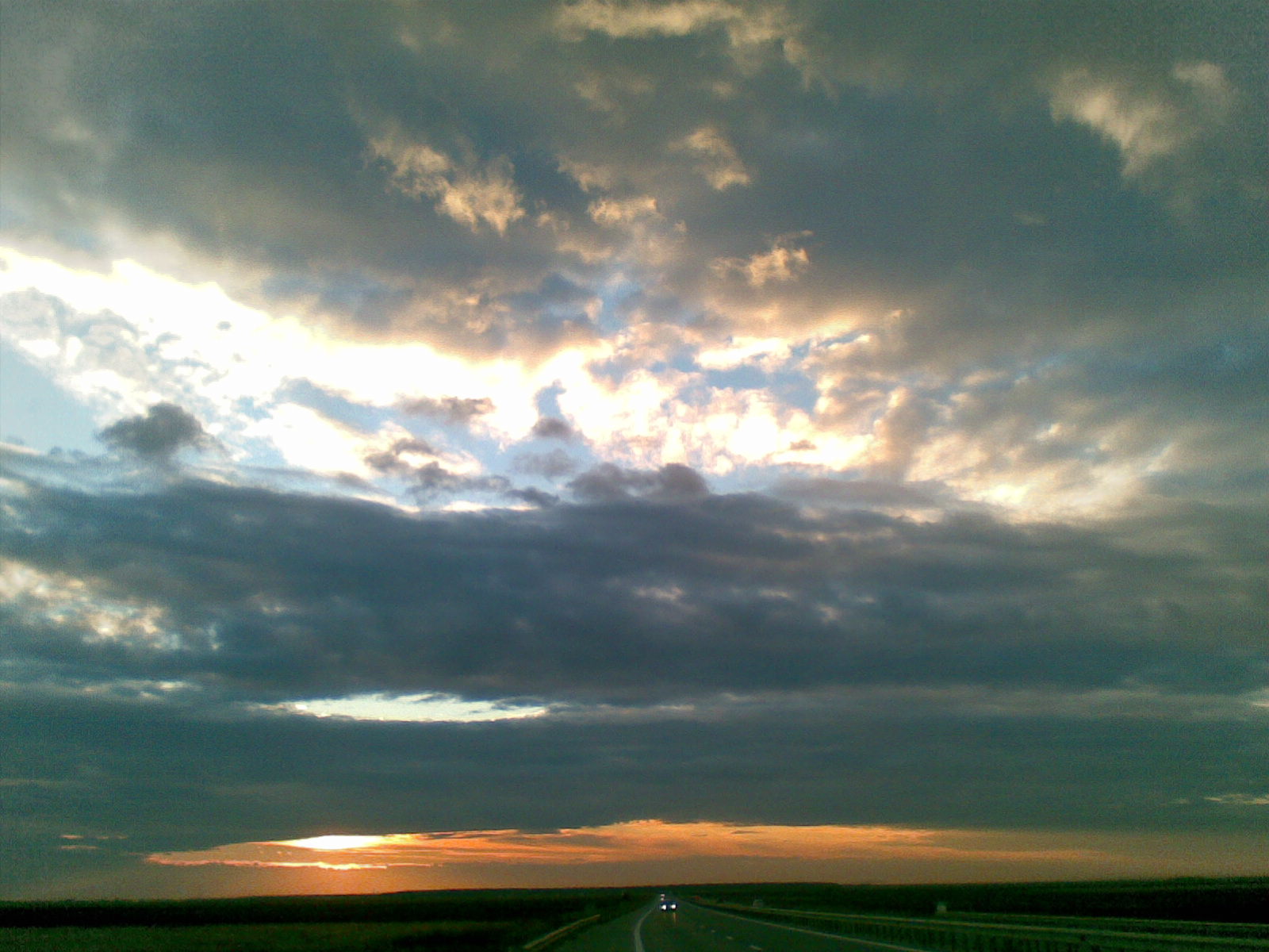 Le-am arătat apusul de soare, unul dintre cele mai încărcate de culori pe care le-am văzut. Am tras două cadre (cu telefonul), apoi am plecat mai departe. Mă uitam mai mult în oglinda retrovizoare decât în fată, dar a fost OK, eram pe autostradă (m-a depăsit si un Fiat 500, dacă mi-am dat bine seama ce era bolidul tzusti :)).