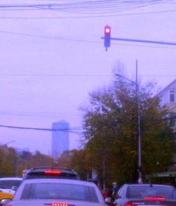 Semafor de pe Calea Floreasca. În plan secund, cea mai înaltă clădire din România. Probabil cea mai nereuşită fotografie a ei. FOTO (cu telefonul): Călin Hera
