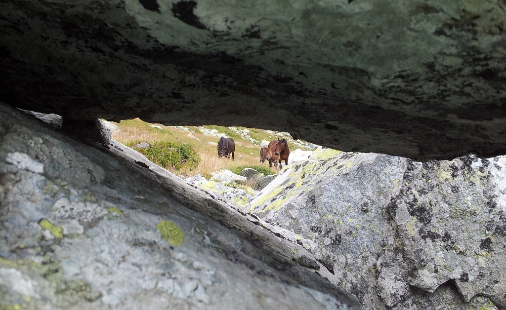 Munții Retezat. Cai pe-un picior de plai, pe-o gură de Rai. Lângă lacul Bucura, sub Curmătură (văzuți printre pietre). Foto cu telefonul: Călin Hera