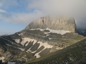 Vârful Mytikas, jumătate nor, jumătate soare. În stânga se ghiceste vârful Profitis Ilias (2.803 m)