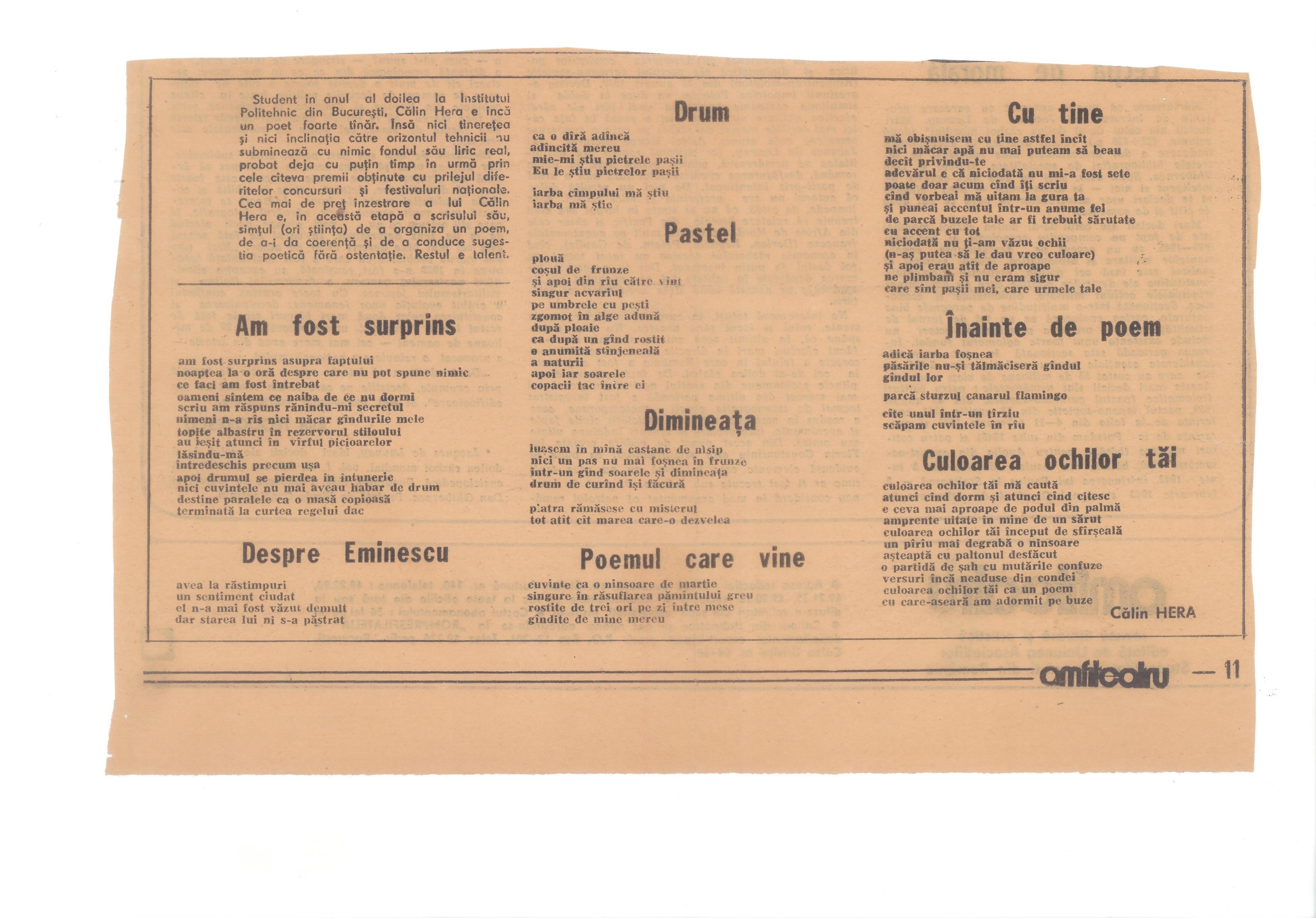 NOTĂ. Prima oară i-am citit această poezie mamei mele. Era în anul 1985. În anul 1989 am publicat-o în revista studenţească ING, revistă despre care, e clar, va trebui să vă povestesc. Răgaz să fie!
