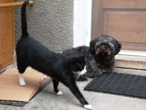Câinele şi pisica. Doi prieteni de voie, de nevoie, pe acelaşi prag de uşă. Foto: Călin Hera (MfC)